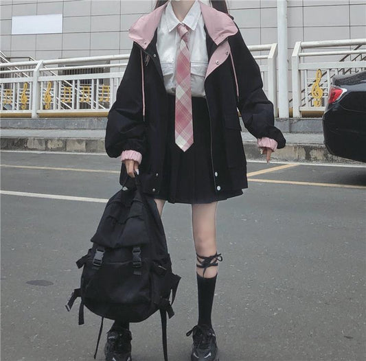 Color-Blocking Hong Kong Style Jacket Female Students Autumn And Winter New College Style Loose Hooded Overalls Jacket